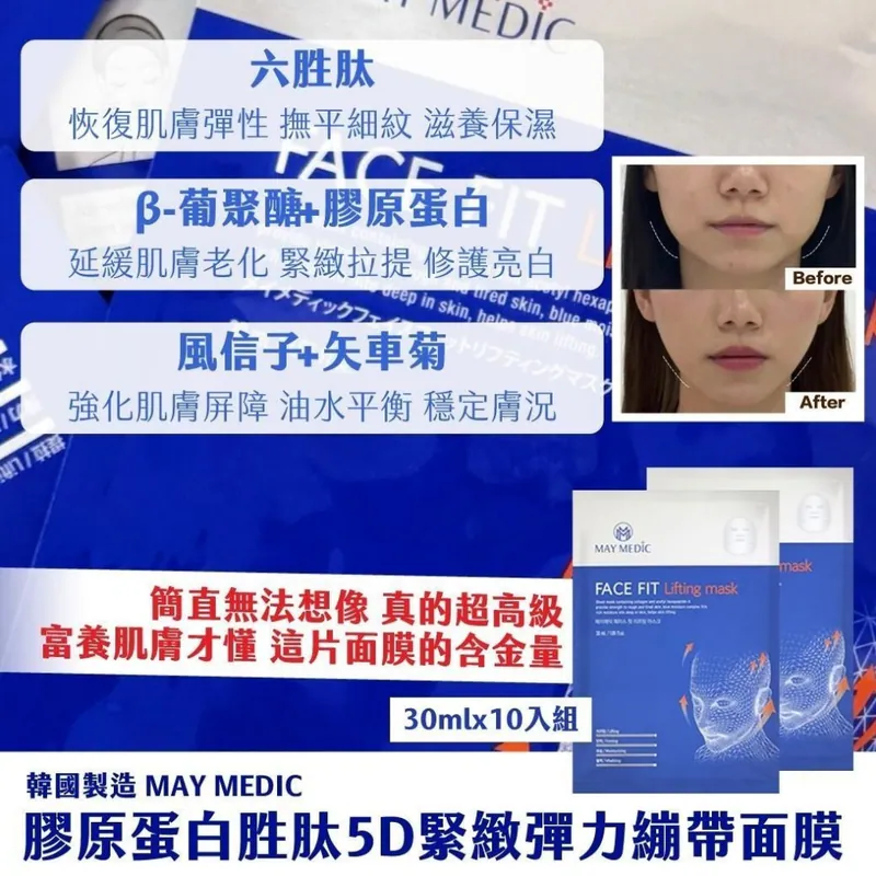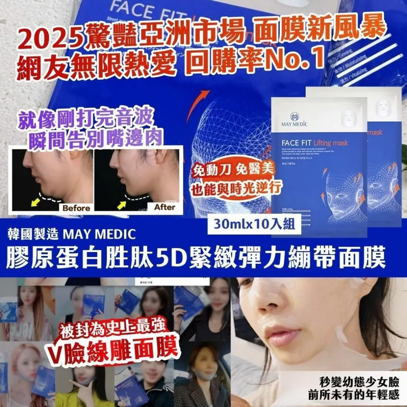 🇰🇷韓國製造|MAY MEDIC膠原蛋白胜肽 5D 緊緻彈力繃帶面膜30ml × 10入組 ❤️HK$49/1組 ╭┈┈┈┈┈╮ ⏰ 限時 團購 🔥 ╰┈┈┈┈┈╯ ⛔截單日期:2/1/2025 - 16:00 📦預計到貨:約4月初到港 ✨2025 驚豔亞洲市場 · 面膜新風暴來襲✨ 🔥 網友無限熱愛 · 回購率 No.1🔥 💎 被封為史上最強「V臉線雕面膜」 敷上去瞬間像剛打完音波✨ 直接向嘴邊肉、下垂說再見! 🌈秒變幼態少女臉,前所未有的「年輕感 」 👍擺脫鬆垮紋路、撐住你的臉部支撐力 ❌免動刀·免醫美,也能與時光逆行 輪廓線緊緻拉提,打造無暇緊緻美肌! ❤️Peptide + 膠原蛋白 革命級修護力 🚀不是敷心酸,而是真有感 🏆 榮獲大韓民國專利號:10-1119337 👑 韓國最強人氣王 📈 累積銷售突破 5,000,000 片 真的很難想像這價格能做到這等級。 富養肌膚的女人,最懂這片面膜的含金量 💰 🌟成份大揭秘 真的無敵高級 ✔ 六胜肽(Hexapeptide) 🔺恢復肌膚彈性、撫平細紋、深層滋養 ✔ β-葡聚醣 + 膠原蛋白 🔺延緩老化 緊緻拉提 修護亮白 ✔ 風信子 + 矢車菊植萃 🔺強化肌膚屏障、平衡油水、穩定膚況 難怪每敷一次就會立刻想囤好幾盒! 真正的「V臉神器」,不是喊口號! 產地:韓國 效期:2027.12