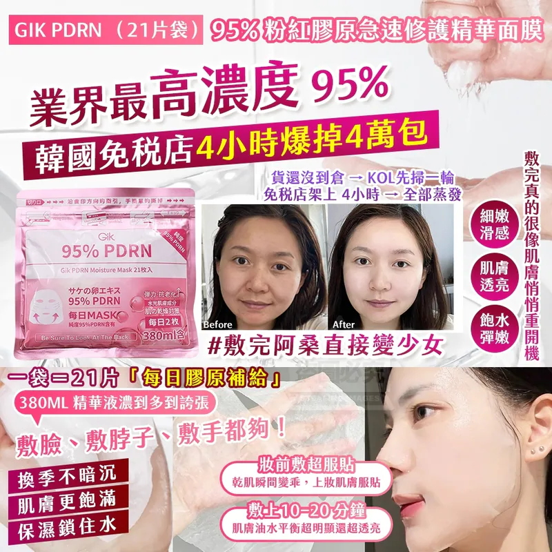 ⏰6/12 韓國製造🇰🇷|GIK PDRN 95%|粉紅膠原急速修護精華面膜 (團購約3月初到港)