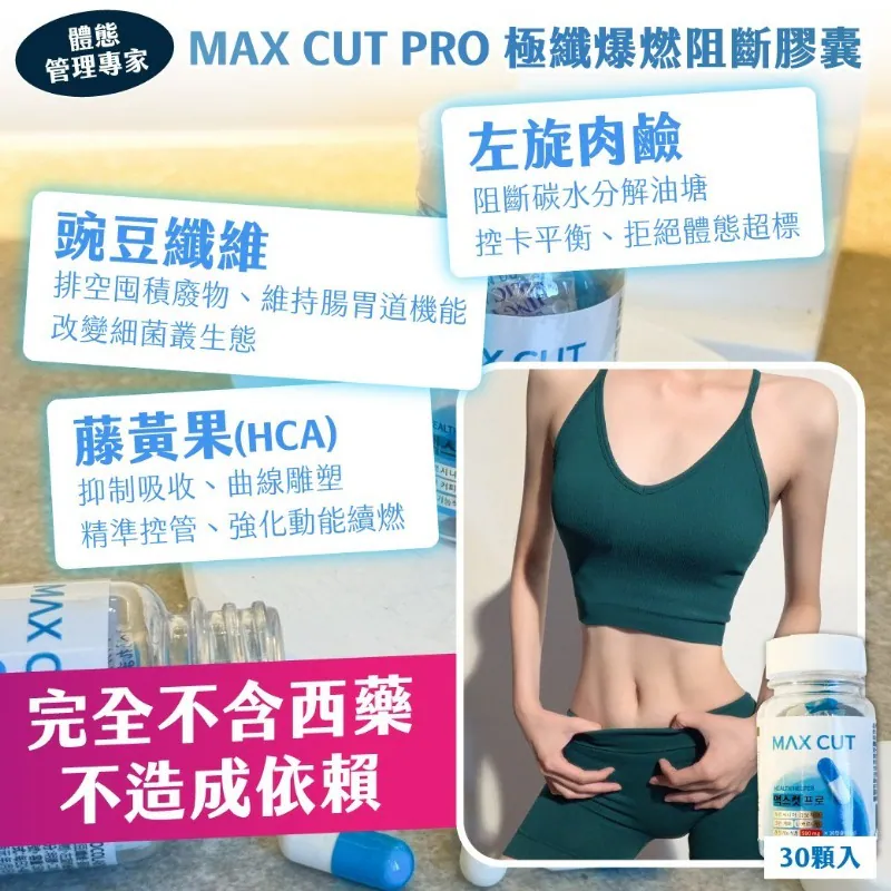MAX CUT PRO 極纖爆燃阻斷膠囊30顆入 ❤️HK$75/1件 ╭┈┈┈┈┈╮ ⏰ 限時 團購 🔥 ╰┈┈┈┈┈╯ ⛔截單日期:8/12/2025 - 16:00 📦預計到貨:約3月初到港 ✨體態管理專家✨ 💃超能窈窕 🔥8倍爆燃代謝💥擊垮"腹"能量!! 💎MAX CUT PRO 極纖爆燃阻斷膠囊30顆入 🔥 2025下半年 韓國窈窕界最強話題 🍽️ 餐後調控|⚡速崩分解|💃超能窈窕 傳說中的「 💙神奇藍色膠囊 」 😲消費者驚呼:輕盈真的快速有感! ⚡解救低迷代謝力 → 一顆爆速燃燒🔥🔥 🪑坐著也有運動感!負擔直接歸零 👑窈窕界霸主 "藤黃果" 👉餐後一顆|找回完美體態 🔥 瓦解囤積|全天不間斷 💧HCA + L-Carnitine (左旋肉鹼) → 8倍爆燃代謝|掌控慾望 🔥超級斷貨王|人氣大爆棚 ❗ 台韓共同監修開發 ❗ 💥 突破卡關|擊垮腹能量 💥 🕐日夜代謝 24hr 不間斷 🌱 關鍵配方|阻斷+排空=無負擔 ☕ 咖啡綠原酸 → 包覆油膩再排出|提升10倍成效 ⚡ 提升30%基礎代謝率 🚫 終結橫向發展|💨 清除負荷一身輕 🧾 安心承諾 ▪️ 完全不含西藥|❌ 不造成依賴 🌟 黃金三大關鍵成分 ✅ 左旋肉鹼 → 阻斷碳水、控卡平衡、拒絕超標 ✅ 豌豆纖維 → 排空廢物、養護腸胃、調整菌叢 ✅ 藤黃果 (HCA) → 抑制吸收、曲線雕塑、續燃動能 💎一顆小藍膠囊 —— 你的「窈窕爆改神器🌟」 產地:台灣 效期:2028.07.13
