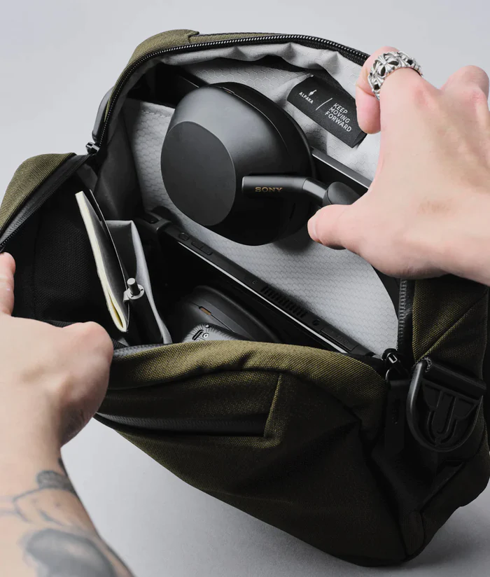 大小很重要,這就是為什麼我們設計了 Go Sling,以比其較小的對應產品 Go Sling Mini 提供更大的容量,同時不妥協於風格。採用我們獨家的 Axoflux® 回收纖維面料製成,Go Sling 不僅環保,而且防水,確保您的物品得到保護。
