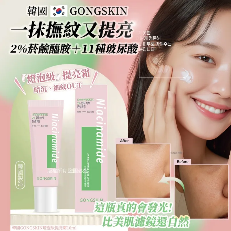 韓國GONGSKIN燈泡級提亮霜10ml( 1套2支) ❤️HK$49/1套 ╭┈┈┈┈┈╮ ⏰ 限時 團購 🔥 ╰┈┈┈┈┈╯ ⛔截單日期:13/12/2025 - 16:00 📦預計到貨:約3月初到港 💡✨ 一抹亮白、細紋瞬間柔焦! 這瓶=開燈級「燈泡肌霜」💖 每天照鏡子👀 是不是覺得膚色暗、氣色黯沉、還多了幾條細紋?😩 這瓶韓妞人手一條的 GONGSKIN 2%菸鹼醯胺亮白提亮霜 直接幫妳「提亮+撫紋+補光」一次搞定⚡ ✨ 亮白像燈泡💡 富含高濃度 菸鹼醯胺+維他命複合體, 擦上立刻透出柔柔亮光~ 不是假白,而是像肌膚自己在發光🌷 💧 撫紋保濕雙修護 「11種玻尿酸複合體+腺苷」完美配方💎 能潤澤乾燥肌、改善細紋, 讓肌膚摸起來滑順細嫩、彈潤飽滿💖 ☁️ 輕盈質地、不油不悶 塗上去瞬間吸收,完全不黏膩! 素顏霜也能當妝前打底使用💄 擦完膚色提亮、氣色更乾淨✨ 📍使用後肌膚變化: ✔ 撫平乾紋 ✨ ✔ 自然提亮 💡 ✔ 改善黯沉 💕 ✔ 持續保濕 💧 ✔ 妝感更服貼 💄 💖 讓妳隨時亮得像開燈一樣✨ 韓國皮膚科推薦的「燈泡提亮霜」 讓肌膚白得發光、細緻又透亮💎 韓國製造 規格:10ml