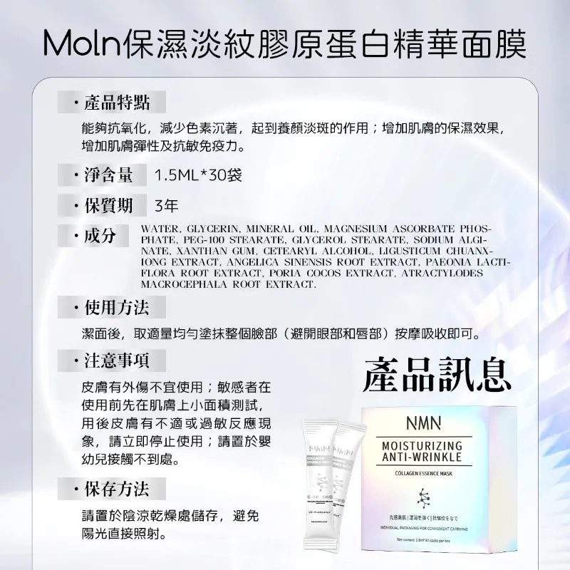 ⏰28/12 Moln NMN 保濕淡紋膠原蛋白精華面膜 (團購約4月初到港)